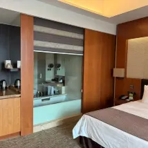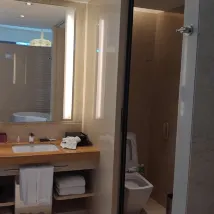 Проживали в других отелях 5*, всегда завтрак был на всех 4х (2взрослых и 2 детей) бесплатный,в этом из семейного номера бесплатно только для двоих,за детей взяли оплату. Также я впервые встречаю отель,где нет прачечной,где можно самостоятельно спуститься и постирать и посушить вещи. Мы в Китае 2 недели и во всех отелях 5* где мы были, я могла самостоятельно постирать детские вещи. Здесь эта услуга платная, да еще и нужно кому-то отдавать свои грязные вещи, это странно. Еда в ресторане хорошая. Номер был соединен с другим,но мы вынуждены были спать без кондиционера, т.к когда его включаешь в комнатах воняет сигаретами и дымом, мы не курим и спать было невозможно.