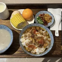 Завтрак в отеле включает свежеприготовленную рисовую лапшу Гуйлинь, которую подают с пшенной кашей, яйцами, зерновыми, фруктами и соевым молоком. С первого взгляда можно сказать, что она тщательно приготовлена.