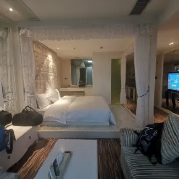 Расположение отеля и удобства хорошие, но номера отеля, похоже, подходят только для интимной пары. Очень темно в коридоре, сексуальные прозрачные занавески в номере, круглая кровать, забавная наклейка с парой на стекле стены.