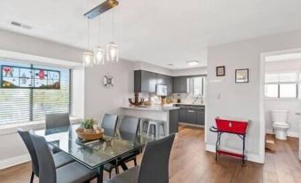 Kitchen: Fully equipped with electric appliances, drip coffee maker and Keurig, dishware, pots/pans, toaster oven, blender, hand mixer, countertop mixer, slow cooker, waffle maker, sandwich press, immersion blender, ice maker, and spices.