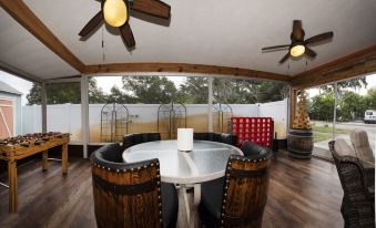 The Wine Cellar in Gulfport Beach is a two-bedroom one-bathroom luxury home designed to immerse the guest in a Tuscany-style vacation on the beach. Conveniently located 1 block from the main street and 4 blocks from Gulfport Beach. Boasting over 1200 sf of home and indoor-outdoor living the Wine Cellar has a bar for 2, a living room for 6 with a 55" TV. There is an enclosed backyard with a privacy fence. The outdoor patio has a barbecue and a gas fire-pit umbrella and Adirondack chairs. The enclosed 450 SF patio has 4 fans, a dining table with wine barrel chairs, a living room set, a 55" TV, in wall fireplace and games like Life size Jenga and Connect 4.