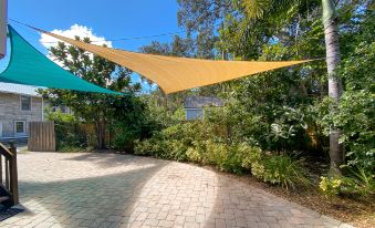 Shake a margarita and sip it in the upstairs sunroom, or prep feasts and share them in your private outdoor yard. This tropical-inspired space is draped by an enormous sail shade to keep afternoon gatherings cool—have a long lunch at the outdoor table, then recoup on the loungers or hammock.