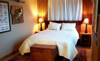 Three separate themed bedrooms give a nod to the history of the cottage and will accommodate two people in each room. Bedroom 1 is the Fishermen Room because the cottage is on one of the best fishing lakes in the country. It includes a queen size bed, with smart TV, dresser for your clothes, closet for hanging items and phone charger port by each lamp, noise canceling machine and shelf to store your luggage.