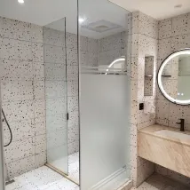 В целом всё нормально, но освещение в комнате слишком тусклое. Вокруг зеркала в ванной нет подсветки.