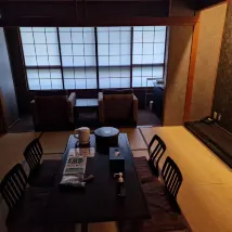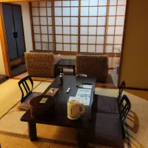 Это рекан, есть: онсен публичный/приватный (1.500 йен/45 мин), бесплатный автомат с кофе/какао/чай, бесплатные массажные кресла. Сам онсен суперский, номера большие, чистые и аутентичные. Ужин кайсеки и завтрак на уровне!
