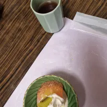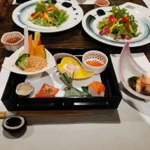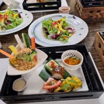 Традиционный завтрак и ужин вкусные и интересные, но организация странная. Надо записаться, потом толпится у входа в столовую. В общем организация хромает.