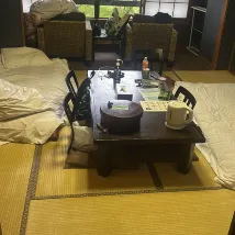 Милая просторная комната, ремонт начала века, но качественный. Деревянные ставни с рисовой бумагой, очень удобные мягкие футоны.