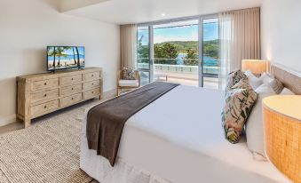 The living area is open and spacious and boasts a state of the art surround sound tv and stereo system. Sit back and relax, while taking in the stunning water views.