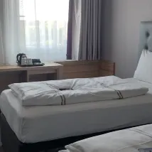 The hotel is ok for the town. It's about a 20 minute walk, but the taxis are about 10-15 euro. The room was as expected, really comfortable beds, and on the whole, not an issue at all. The trains went almost under our room, but once the window was shut, it really wasn't an issue. The staff here couldn't have been any more unfriendly if they tried, however. From check-in to most interactions, they just weren't interested in the slightest. There was 1 young lady who was really nice, 2 young lads that were just ok and then the rest were just awful. Made us feel truly unwelcome and uncomfortable. Was more annoyed when they were chatty and friendly with other national guests but really off with us. Totally put us off returning as we had hoped for the octoberfest. Wouldn't recommend for British guests.