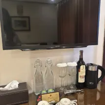 У нас был большой номер, всё предусмотрено:мини бар, бутылка красного вина, чай, кофе, вода., халаты, сейф.