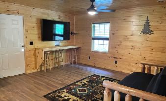 It also has a full kitchen with a full size fridge, kitchen sink, stove/oven microwave and a standard coffee maker. If you don't want to cook the Rail House Grill is nearby where you can either eat in or have them deliver to your cabin. It's conveniently located about 10 mins from either the town of Harlan or Cumberland.