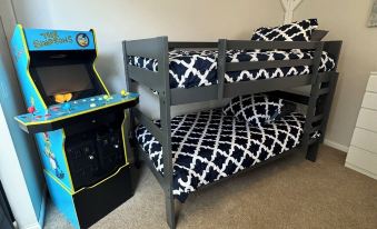 -"Bedroom" #4 with two twin size bunk beds with memory foam beds, dresser and arcade game.