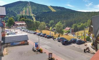 Cosy apartment block, 3 storeys. In the centre of Harrachov, in a busy position, 300 m from the skiing area. In the house: central heating system. Parking at the house. Supermarket, restaurant, café 50 m, bicycle rental 300 m, bus stop "Harrachov, centrum" 100 m, railway station "Harrachov" 3 km, outdoor swimming pool 1 km. Golf course (9 hole) 4 km, tennis 1 km, ski lift, chair lift, slopes 300 m, ski rental 10 m, ski school, cross country ski track, children's playground 200 m. Nearby attractions: Bobová dráha, Muzeum skla 1 km, Skokanské můstky Harrachov 1 km, Mumlavský vodopád 1.5 km, Vosecká bouda, Dvořačky 9 km, Huťský vodopád 9 km, Vodopád Kamienczyka, Szklarki (PL) 12 km. Well-known ski regions can easily be reached: Čertova hora 300 m, Zákoutí 1 km, Ryžoviště 2 km, Kořenov 7 km, Rokytnice nad Jizerou 15 km. Hiking paths: Vodní nádrž Souš,Dinopark(Pl),Termy (Pl) 15 km, Park miniatury Kowary44km,Karpacz (Pl) 39 km, Giganteria Piechowice 23 km. The keys‘ handover takes place by the agency Interhome Harrachov. "Harrachov Central Nest", 1-room studio 26 m2, on the top floor. Living/sleeping room with sloping ceilings with 1 bed, 1 double bed and satellite TV. Kitchenette (2 hot plates, toaster, kettle, microwave, electric coffee machine) with dining table. Shower/WC. View of the countryside. Facilities: Internet (WiFi, free). Please note: suitable for families. Non-smokers only. HARRACHOV CARD guest card included in the price.