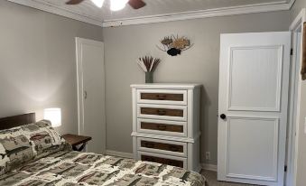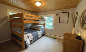 This three bedroom/1 bath cabin has an open floor plan with the dining room, kitchen, and living room open to each other. This area is very well lit and has two windows facing the lake with a great view! Each bedroom has a dresser and closet and a quilt covered bed. There’s also a queen pullout couch in the living room. A desk with high-res 27” monitor is ready for your laptop if you need to catch up on any office work while you’re away with excellent WiFi available thru the house. Enjoy sunny days on the deck, fishing or water activities down by the dock, and yard games and fires in the back yard!