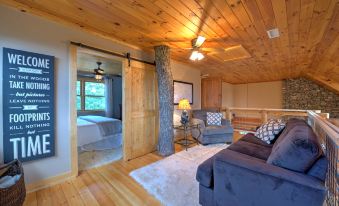 This contemporary cabin boasts a rustic elegance with a classic country lodge aesthetic that features details such as the gas-converted wood cook stove and the river rock stone fireplace. There's plenty of room for everyone to gather together in the large living and dining area, and the flat screen TV includes satellite programming with an NFL Sunday ticket in season. The main level's spacious floor plan also includes a fully equipped kitchen that's ideal for crafting home-cooked meals, and a full bath with both a claw-foot tub and a shower. At the end of the day, savor the privacy of the upstairs main suite, where a loft sitting area, a second full bath, and a roomy walk-in closet offer everything you'll need to settle in!