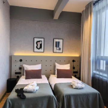 Receptionists are friendly and helpful. Room design is great. Spacious. Great variety in breakfast buffet. Nice sauna and gym.