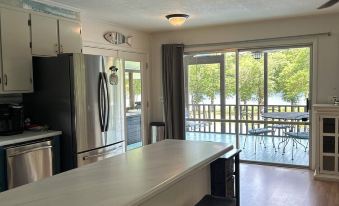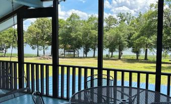 Enjoy wide views of Thomas Mill Creek, the Big Lake and our Cove from the upstairs screened in porch or from the ground level covered patio. Over 1000 sf of covered outdoor space allows you to enjoy being outside in almost any weather. We have a sandy beach on a quiet cove that is the perfect place to enjoy the water. Our boat dock, equipped with electricity, is inside the cove and protected from wind and waves. The big flat lakeside front yard is great for playing games or bird watching. The street side backyard has a large circular driveway with spacious parking for trucks and boats. LAKEFRONT LODGE is located on Lakefront Drive which is a wonderful community with many full time residents. Respect for neighbors is a requirement to rent this property. Formerly VRBO #2951807 a 10/10 five star propertyAbout pets:Pets allowed: dogs less than 20 lbs per pet (limit one pet total).About checkOut:Check out before 10:00 AM.About children:Children allowed: ages 0-17.About checkIn:Check in after 4:00 PM.About smoking:Smoking is not permitted.About minBookingAge:Minimum age to rent: 35.About events:No events allowed.
