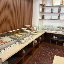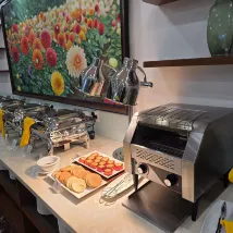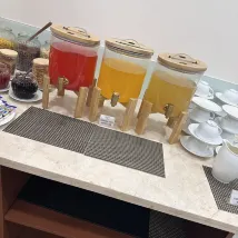 На завтрак выбор очень ограничен, если вы не едите мясо. Соки (клубничный, яблочный, апельсиновый) были еле тёплыми и не соответствовали заявленному вкусу. Мне просто посоветовали добавить кубики льда. Я видел, что другие гости оставляли свои стаканы, так что проблема была не только у меня. В первый раз кофе был нормальным, а во второй – откровенно отвратительным. К счастью, кофейные капсулы в номере были хорошими.