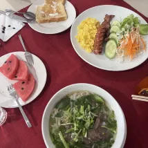 Завтрак представлял собой простой шведский стол с выбором блюд по-американски, корейского рамэна, говядины и рисовой лапши. Когда я пришел туда, там была рыба на пару, круглая рыба, макароны с томатным соусом, жареный рис, арбуз и драконий фрукт — все это. были восхитительны.