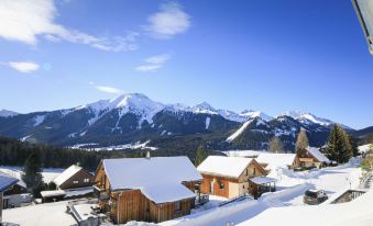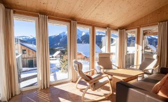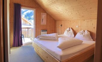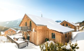 Hohentauern: In the 1st Austrian sports village awaits you cosy holiday village "Almdorf Hohentauern by Alps Resorts", 1'300 m a.s.l.. 300 m from the centre, in a sunny position, 15 km from the lake, 300 m from the skiing area. For shared use: natural state property. In the complex: reception, WiFi, central heating system. In Winter: please take snow chains. Parking at the house, public parking. Grocery 300 m, restaurant 250 m, railway station "Selzthal" 8 km, thermal baths "AQUALUX Fohnsdorf" 36 km, bathing lake "Gaishorn am See" 15 km. Golf course (18 hole) 35 km, ski lift, skisport facilities, slopes 300 m, ski school 1.5 km, cross country ski track 300 m. Nearby attractions: Pfahlbaudorf 1 km, Schaubergwerk Oberzeiring 22 km, Red Bull Ring Spielberg 35 km. Well-known ski regions can easily be reached: Lachtal, Kreischberg. Hiking paths: Gesäuse, Triebener Tauern. Please note: In case of good snow conditions, the house is accessible on skis. "Premium 14 mit IR-Sauna", 6-room apartment 145 m2. Bright, comfortable and tasteful furnishings: 4 double bedrooms. 1 room with 1 x 2 bunk beds. Living/dining room with dining table, satellite TV and flat screen. Open kitchen (oven, dishwasher, 4 ceramic glass hob hotplates, toaster, kettle, microwave, electric coffee machine). 3 showers/WC, sep. WC, Sauna. Terrace, small garden. Terrace furniture. Very beautiful view of the mountains and the countryside. Facilities: Internet (WiFi, free). Please note: non-smokers only. The sauna is an infrared cabin!