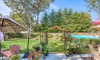 Sprawling fenced in backyard with lushly maintained grass, vegetable garden in the summer, and an abundance of flowers Japanese maple trees. Top of the line bedding and linens for a great night's rest, indoor and outdoor fireplace with plenty of provided fire wood, brand new Weber gas grill with full tank of provided, and an enormous kitchen with farmhouse table for up 12ppl for entertaining and preparation.About pets:Pets allowed: less than 20 lbs per pet (limit 2 pets total).Guest required to clean up droppings after pet.About checkOut:Check out before 11:00 AM.About children:Children allowed: ages 0-17.*use caution at all times in/around pool area..About checkIn:Check in after 4:00 PM.About smoking:Smoking allowed: in designated areas.Whether you smoke or burn pls do all outdoors.About minBookingAge:Minimum age to rent: 21.About events:No events allowed.