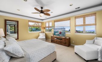 Each of the three guest bedrooms is thoughtfully designed with cozy bedding, ample storage, and ceiling fans to keep you cool during warm Kona nights. One guest room features a private ensuite bathroom, while the other two share a beautifully appointed full bathroom with a shower/tub combination.