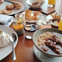 Завтрак также очень разнообразный, пельмени с креветками и сиу май очень вкусные.
