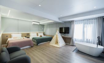 房間非常漂亮,帶起小朋友太適合了,小朋友很高興,出來玩不就是為了孩子開心嘛,離漂流近,過個橋就是 停車也方便,吃東西方便得很離步行街很近。