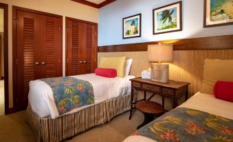 This penthouse comfortably sleeps up to six guests. The primary bedroom is a serene retreat featuring a plush king-sized bed, direct lanai access, and an en-suite bathroom with dual vanities, a soaking tub, and a walk-in shower. The second bedroom offers a cozy queen bed and its own en-suite bathroom, providing both comfort and privacy. The third bedroom is versatile with two twin beds that easily convert into a king, making it perfect for children or couples. The villa also features a third full bathroom for added convenience.