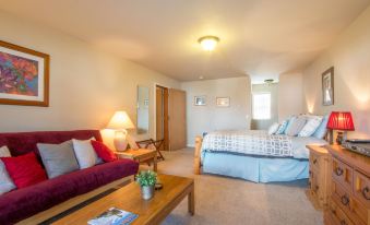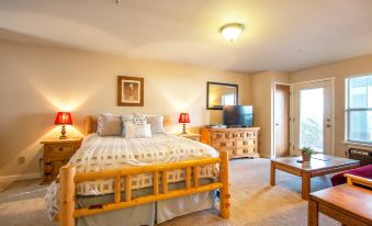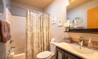 This 1-bedroom 2-bath unit is both charming and comfortable. Walking through the front door, guests are greeted by a comprehensive open-concept floor plan that seamlessly blends the living, dining and kitchen space to maximize square footage. A bright yellow wall in the living room is a lovely pop of color against the soft color palette used in the kitchen and dining space. Plush and colorful furnishings, eye-catching wall art and soft carpeting make the living room of this Hood River vacation condo a wonderful place to lounge and relax with family and friends. The dining room table is able to accommodate four and acts as a makeshift divider between the living room and kitchen. This unit also has A/C for your comfort.