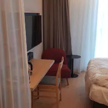 Отель современный, со светлыми чистыми номерами, небольшой функциональной ванной комнатой, чайником, холодильником, водой и столешницей с розетками для работы. Телевизор с большим экраном и достаточным количеством каналов для просмотра.