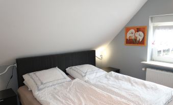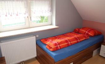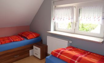 2-family house. 200 m from the centre of Hooksiel, 14 km from the centre of Jever, 15 km from the centre of Wilhelmshaven, 2.5 km from the sea, 2.5 km from the beach. In the house: central heating system. Parking at the house. Shop 200 m, supermarket 800 m, café, bicycle rental 500 m, bus stop 300 m, sandy beach 2.5 km, indoor swimming pool 500 m. "Strandkorb", 3-room apartment 75 m2 on 2 levels. Modern and cosy furnishings: open living/dining room with satellite TV (flat screen). Exit to the terrace. Open kitchen (oven, dishwasher, 4 ceramic glass hob hotplates, toaster, kettle, microwave, electric coffee machine) with dining nook. Bath/shower. Gas heating. Upper floor: 1 room with 1 double bed (180 cm, length 200 cm). 1 room with 2 beds (90 cm, length 200 cm). Terrace 15 m2. Terrace furniture. Facilities: washing machine. Internet (WiFi, free). Please note: non-smokers only. Maximum 2 pets/ dogs allowed. Smoke alarm.