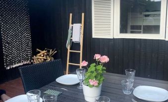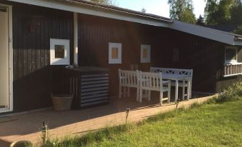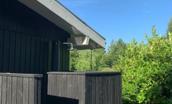 The black wooden summerhouse with white windows and doors is completely undisturbed on a quiet road, providing a very special calm around the house. Here you can just hang out as a family, take your breath away, and enjoy the holiday life.