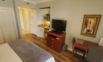 Ocean view studio on the 6th floor of Royale Palms, connected to Hilton, Myrtle Beach. It's renovated with new flooring and new furniture. It provides everything for romantic getaways. With spectacular sunsets, timeless views of the Atlantic Ocean from your own private balcony. Furnished with a king size bed and desk area, you'll also have a coffee maker, coffee, sugar and cream, microwave, small fridge and prep kitchenette. There are 3 chairs... One lounging and 2 table/desk chairs. Walk to the sand just over the boardwalk to enjoy the coastal lifestyle that Atlantic Ocean has to offer.