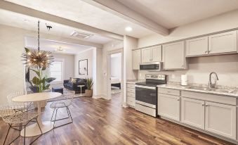Built in 1905 and lovingly restored + updated, The Gertrude Suite at The Evanston is a centrally-located stay in downtown Hot Springs. This suite is located on the second floor of this historic sandstone building.