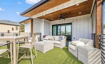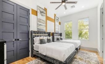Prince Emanuel... Stunningly modern, professionally designed and sleek with clean lines sits in the heart of East Downtown Houston. The wide open living space easily accommodates up to 17. Enjoy 5 bedrooms and 4.5 bathrooms plus stunning views from the rooftop deck.