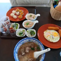 Есть завтрак, можно заказать яичницу или суп и небольшой шведский стол: пельмешки, лапша, рис с курицей. Чай, кофе, тосты, арбуз. Завтрак нам понравился, после него можно не обедать)