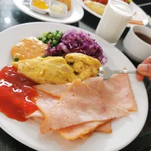 Очень прохладно, спокойно, весело, чисто, хорошее обслуживание, вкусный завтрак.