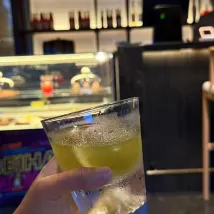 Безалкогольный напиток на двоих: приятно было вместе вечером на первом этаже насладиться бесплатным безалкогольным напитком со вкусом апельсина цвета заката.