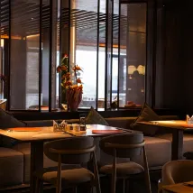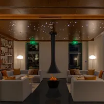 Обстановка отеля не уступает курортному отелю, а в номерах есть капсульная кофемашина, массажное кресло для ног и библиотека.