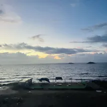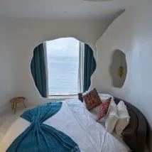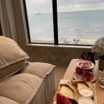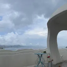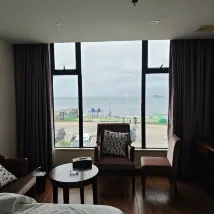 酒店面對海灘,位置相比附近建築物是凹入了,前面是有頹垣敗瓦的停車場、右邊是荒廢酒店, 景觀略受阻, 房間向海但前面有附有卡啦OK的燒烤場,若有人唱歌,聲海頗大,噪音直至午夜,関了窗仍清楚聽到。房間沒有掛衣服的地方,只能掛在木梯上,有點不足,有一排大概四個的掛鈎在沐浴間,不過在沐浴間,除了洗澡,根本不能用,但洗澡時掛衣服又可能會濕⋯而且洗手間很昏暗, 沐浴間隔很大但沒有燈,浴室水龍頭,連個小碟子放洗頭水都冇,只能放在靠近地上的窗邊(即房間有大窗簾裝飾後面),洗手盆上的水龍頭已經氧化了, 搖下搖下,足見年代久遠⋯坐在沙發看海景本來幾好,但沙發靠背不能靠,因為是由兩個подушка堆在一起,小心勿靠。優點是:特式房間送早餐和旅拍(提早預約丶包3張電子相)藍天白雲時,頂樓拍照效果不錯(水泥地除外)又可看日出日落!入住時可聯絡管家,安排預約送上房間的時間,送早餐的管家笑容親切,即做的早餐很好吃!尤其是豆漿,豆味香濃又不甜!最讃!別到附近觀海洒店按摩沐足,空調不夠、沒技術可言,敷衍了事, 138元70分鐘,實際只有30分鐘加5 дней в году.