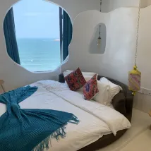 Расположение отличное. Внизу находится пляж. С верхнего этажа открывается вид на море и пляж. В солнечный день 🌞 вы можете наблюдать восход солнца 🌅. Он находится в 20 минутах ходьбы от дамбы Влюбленных и недалеко от залива Черепах и залива Шуанъюэ. Поблизости есть много ресторанов. Помещения и оборудование полностью готовы. Хоть и немного устарело, гигиена вполне хорошая. Вода в ванне очень хорошая. Это хороший отель.