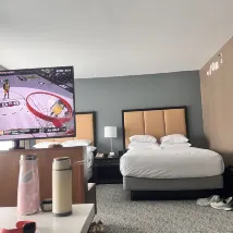 A nice hotel with spacious rooms and a good, regular shuttle to the airport—if it’s 10-15 minutes, so not exactly an airport-adjacent hotel. I arrived late and left early but the staff was helpful and welcoming and the room was quite large, a good bathroom in which to freshen up. I would happily stay again.
