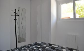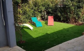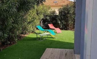 -Outdoor equipment on 100m2 of private land, closed, lit and not overlooked: shaded terrace, table with chairs and armchairs, lounge, chairs, electric barbecue, clothes dryer, water supply with shower, mattress beach with backrest, boules balls .... Independent entrance.