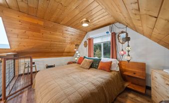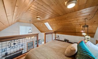 The open kitchen combines style and functionality, with a farmhouse sink, butcher block counters, a retro mini-fridge, and a propane stove with an oven. A newly crafted loft with a king bed adds charm, while the split-level bedroom includes a queen Murphy bed and a desk for remote work.