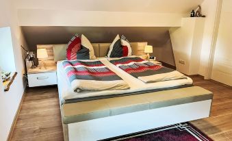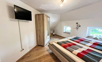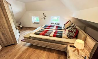 Ihlow 12 km from Aurich: 2-family house. In a secluded, quiet position, in a cul-de-sac, in the countryside. For shared use: large garden with lawn. In the house: storage room for bicycles, central heating system. Parking at the house. Bus stop 1 km. "Ferienhuus up Hütten", 2-room apartment 110 m2, on the top floor. Partly with sloping ceilings, renovated in 2025, tasteful and cosy furnishings: living room with satellite TV (flat screen). 1 room with 1 double bed (2 x 90 cm, length 200 cm), satellite TV (flat screen). Open kitchen (oven, dishwasher, 4 ceramic glass hob hotplates, toaster, kettle, microwave, electric coffee machine) with dining table. Exit to the balcony. Bath/shower/WC. Small balcony, terrace. Terrace furniture, balcony furniture. Facilities: mosquito net, children's high chair, baby cot (extra), hair dryer. Internet (WiFi, free). Parking at the house. Please note: non-smokers only. Private entrance, smoke alarm.