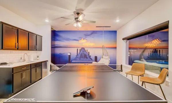 Moving into the hallway, there’s a King suite on the left with a 55” Smart TV and desk for those who work from home, and a kids’ bunkroom on the right with two sets of triple bunks and lots of games to entertain including a Ms. Pacman arcade, giant Connect 4 and an assortment of board games. The bunkroom, like all the bedrooms, has an attached bathroom, and this one has a bathtub for the littles. Leaving no space untouched, the long and skinny room under the stairs has been converted to a putting green with automatic ball return! Continuing down the hallway you’ll find another laundry room, a fourth King suite on the right with an aviator chair and 55” smart TV, and a final suite on the left outfitted with two queen beds.