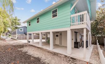 Downstairs, the home provides an ideal space with family and friends in the spacious open area, Additionally, the downstairs area includes a bathroom and shower, conveniently located for rinsing off after a swim in the Gulf.