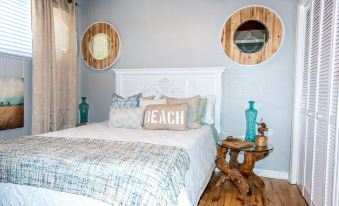 • Beach chic motif with updated furniture and vintage beach art