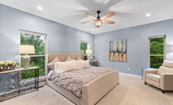 With 5 spacious bedrooms—4 featuring king-sized beds and a 5th equipped with 2 queen beds, a twin-over-twin bunk, a twin daybed with a trundle, plus a pull-out couch and air mattress—there’s room for everyone to relax. Each bedroom includes its own ensuite bath, and all beds feature premium linens for the perfect night's sleep.